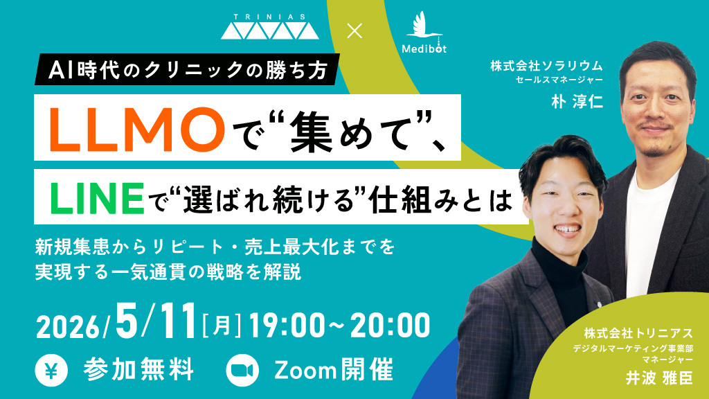 本ウェビナーでは、LLMOによる集患設計と、LINEを活用した継続的なコミュニケーションを組み合わせ、集患からリピートまでの導線をどのように構築すべきかを実務ベースで解説します。再来院を促す具体的な接点設計や、現場で成果につながる運用のポイントをお伝えします。